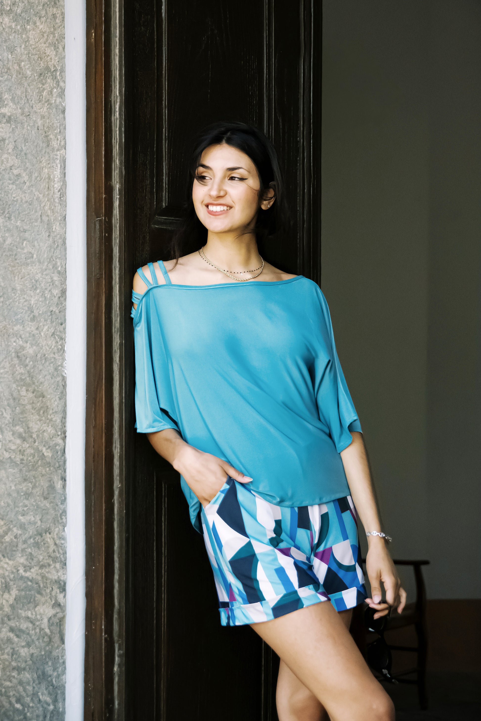 Ses manches mi-longues couvrent subtilement le haut des bras, et l’épaule légèrement dévoilée ajoute de l’élégance à ce top décontracté chic.