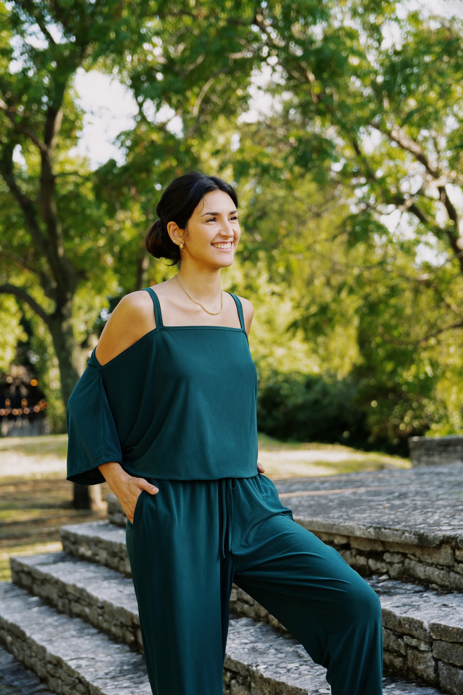 Les épaules sont très dénudées pour un look ultra féminin. La coupe du pantalon est ample au niveau des hanches et style carotte en bas, assez courte.