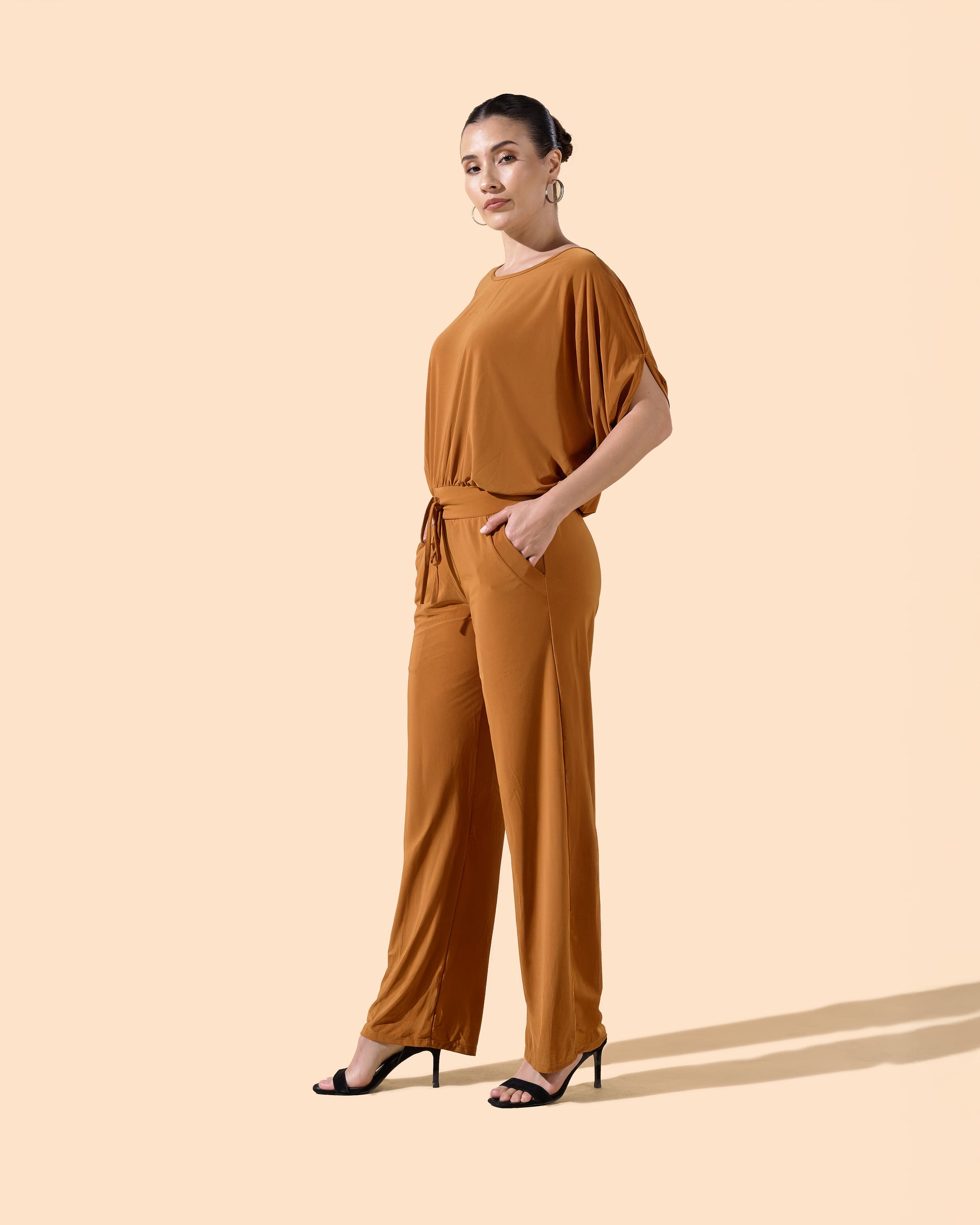 La combinaison pantalon Prya, fluide et chic, sa coupe ample, son haut blousant et ses manches oversize dissimulent subtilement le ventre et les bras.